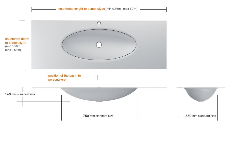 The lenght and depth of the surface, the position of the basin (left, right or central), the colour, the finish can be personalised. The image shows an example of Oval 750 created with the following parameters: